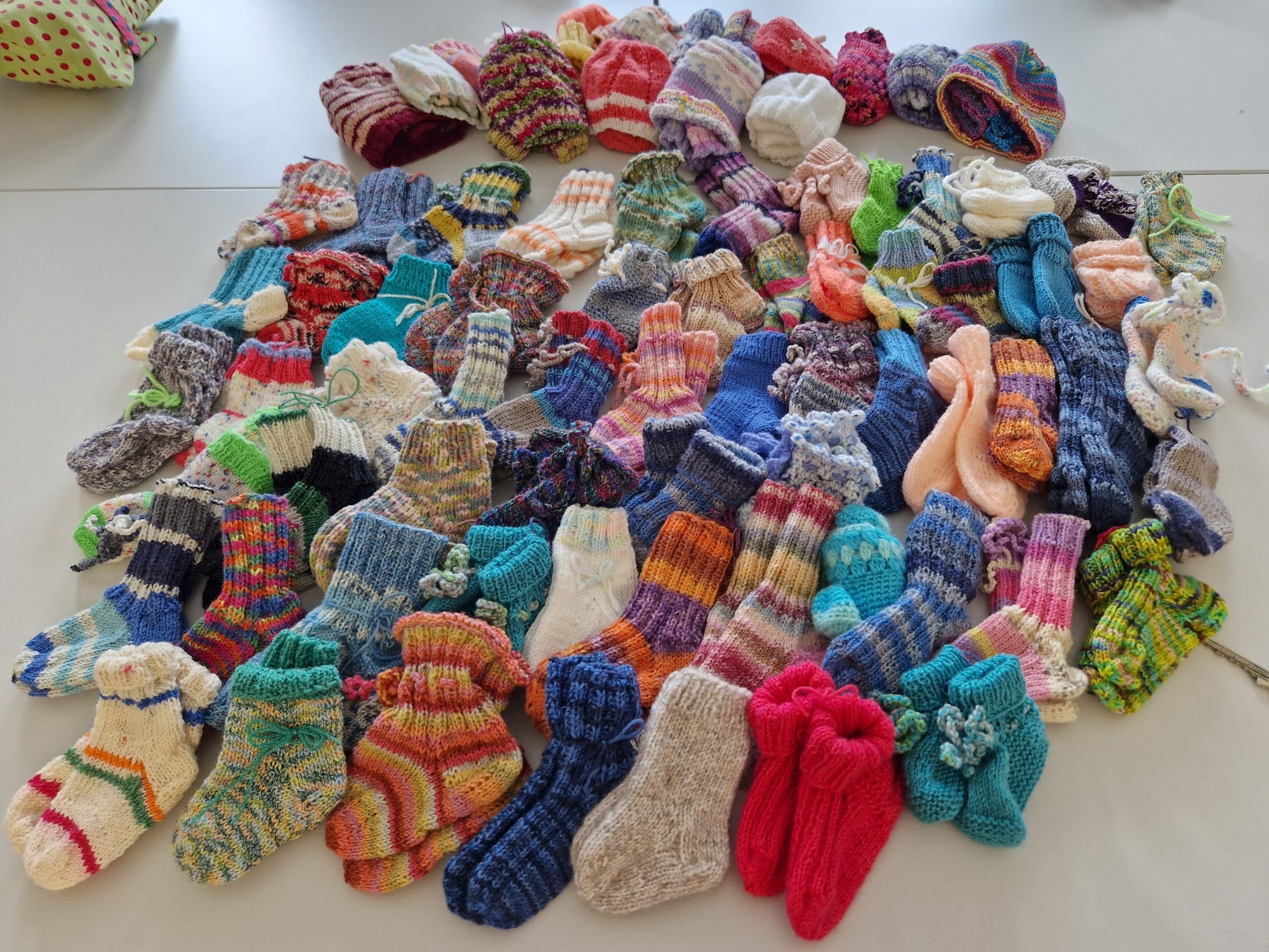Über Letzteres freute sich Frau Rappmund von der Schwangerschaftsberatung der Diakonie Weinheim. Erika Fabian, die Leiterin des Strickcafés, und ihre Strickerinnen überreichten Frau Rappmund in einer der letzten Strickstunden winzige, bunte Babysöckchen für die Neugeborenen. Die Damen des Strickcafés stricken unter anderem auch für den Frühchen e.V. Heidelberg sowie für Teilnehmer des Weinheimer Mittagstischs, die in der kalten Jahreszeit mit warmen Socken, Mützen und Schals bedacht werden. Seit diesem Monat wird auch schon fleißig an farbenfrohen Zipfelmützen gearbeitet für die diesjährige Weihnachtsaktion.